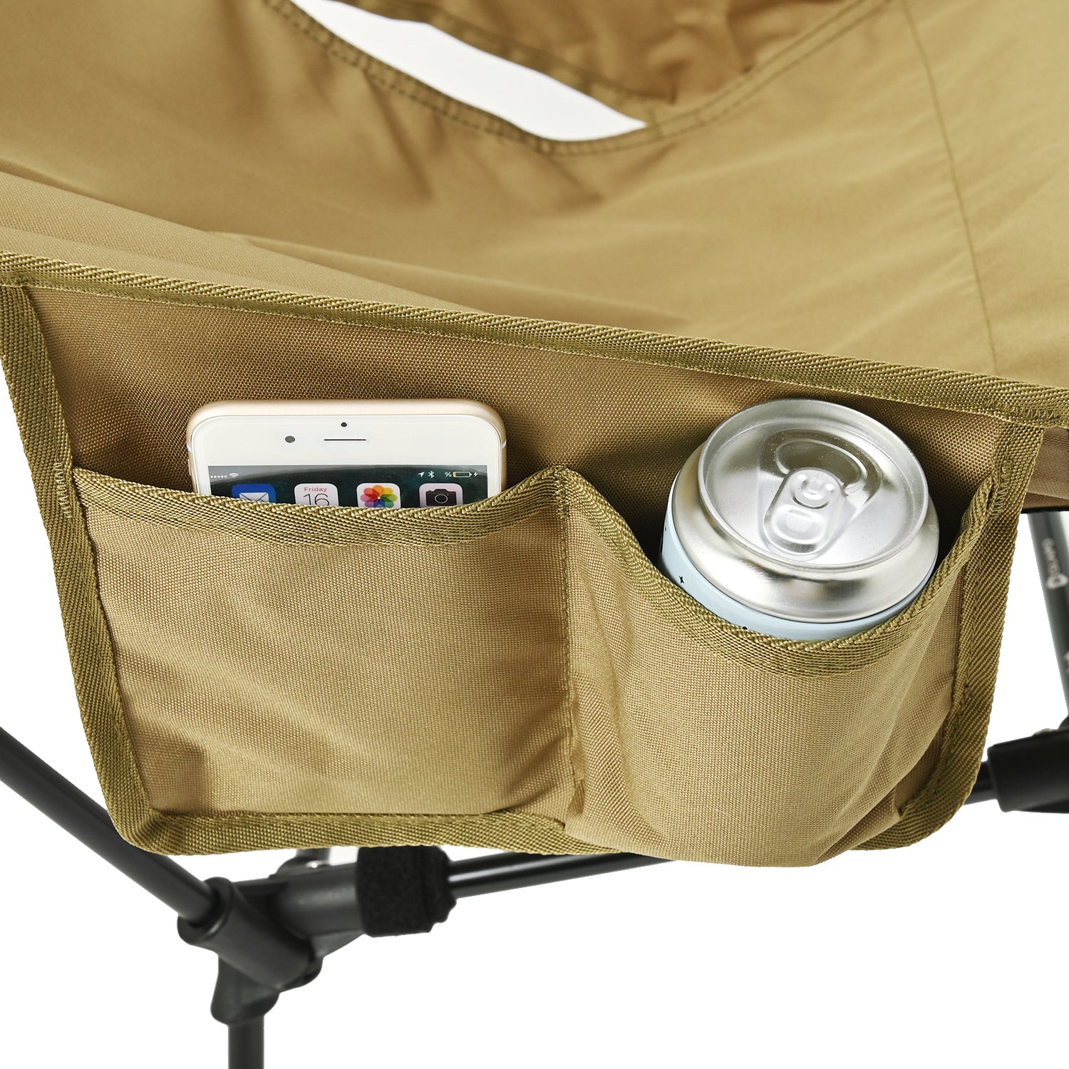 チェアの右側に2種類のポケットを装備!1つはドリンク用で350ml缶や500ml缶はもちろん、缶クーラーを装着したままでもOK!缶と同じぐらいの直径であればタンブラーなどもそのまま入れることができます。 もう1つは、スマホや小物収納用のポケットで、iPhone12ProMaxなど6.7インチの大きいスマホも入るサイズ感です。公園や水辺などの好きな場所に アウトドア用チェア を置き、座ってリラックスしたり、好きなドリンクを飲んだりしながら過ごすチェアリングにもピッタリです♪